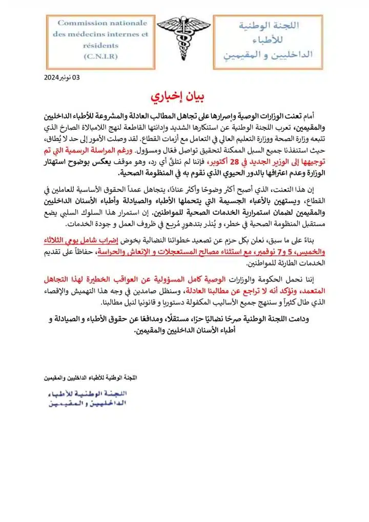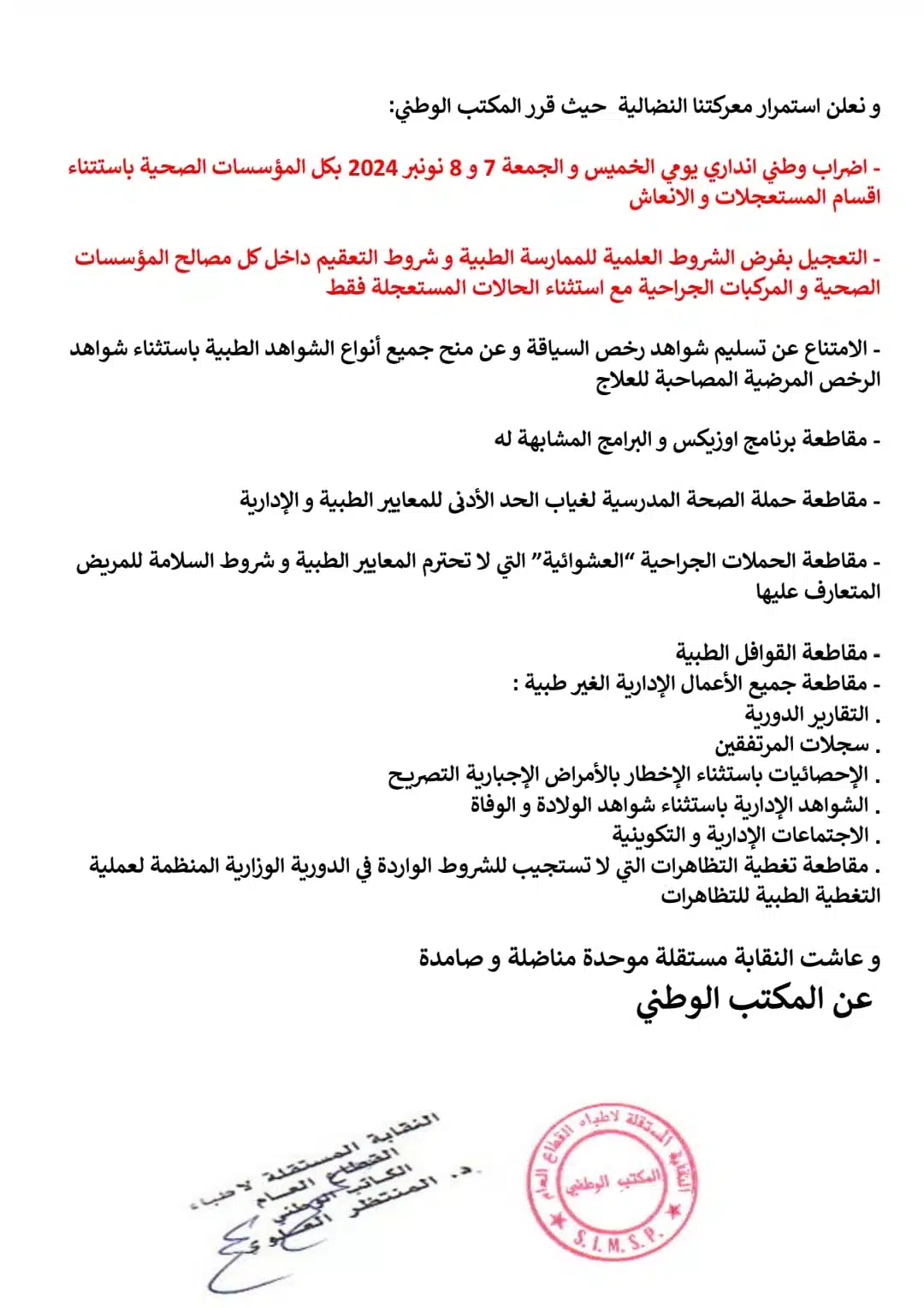 Si le mutisme du ministère de tutelle se poursuit, la coordination et le SIMSP prévoient d’annoncer, ultérieurement, des programmes d'action intensifiés, qui commenceront par le boycott de l'exécution de tous les programmes de santé et de leurs rapports, des réunions administratives, des unités mobiles et des caravanes médicales, des programmes de chirurgie à l'exception des interventions urgentes, des examens médicaux spécialisés dans les hôpitaux, des opérations de recouvrement des factures des services fournis dans les hôpitaux, ainsi que de toutes les permanences à caractère purement administratif.