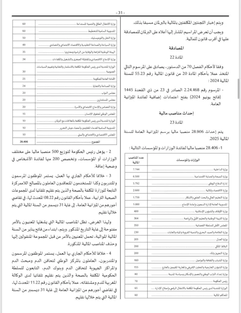 Dans le PLF 2025, "on a été surpris de voir que ces deux points n’ont pas été préservés". Le troisième alinéa de l’article 23 relatif à la création de nouveaux postes budgétaires (fac-similé ci-dessous) stipule ce qui suit : "Contrairement aux dispositions en vigueur actuellement, les fonctionnaires titulaires, stagiaires ainsi que les contractuels des services non centralisés relevant du ministère de la Santé, qui seront automatiquement transférés aux Groupements de santé territoriaux, en application de la loi 08.22 (portant création de ces groupements, ndlr), continueront à percevoir leurs salaires depuis le budget général de l’Etat jusqu’au 31 décembre de l’année budgétaire de leur transfert".