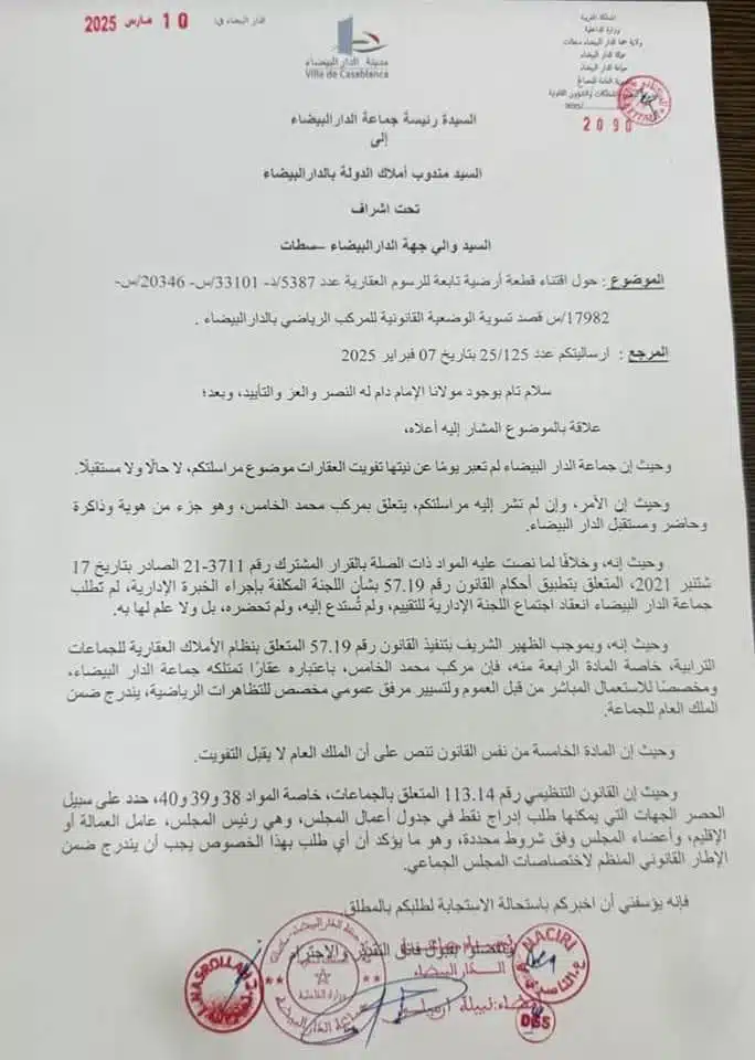 "À Casablanca, la situation est similaire : la commune ne possède que le terrain, tandis que l’État a financé la reconstruction du stade. Soit la commune rachète l’infrastructure, soit l’État rachète le terrain. En tous les cas, c’est une contrainte juridique. Il s’agit donc simplement de l’assainissement normal d’une situation juridique".