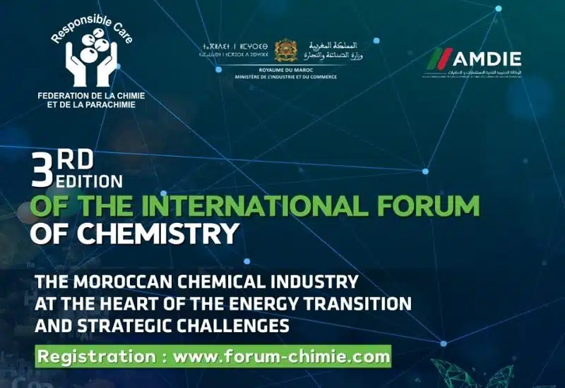 La Fédération de la chimie et de la parachimie organise la 3e édition du Forum international de la chimie, les 21 et 22 mai 2025 à Rabat, en partenariat avec le ministère de l’Industrie et du commerce et l’Agence marocaine de développement des investissements et des exportations (AMDIE).