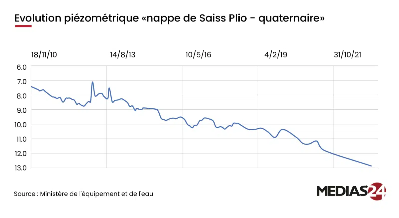 La nappe de Saïss enregistre une baisse continue de ses niveaux piézométriques depuis le début des années 80, variant entre 3 m dans le secteur au Sud-Est de la nappe et 3.6 m au sud du plateau de Meknès. Une accentuation de la baisse est remarquée depuis 2016.