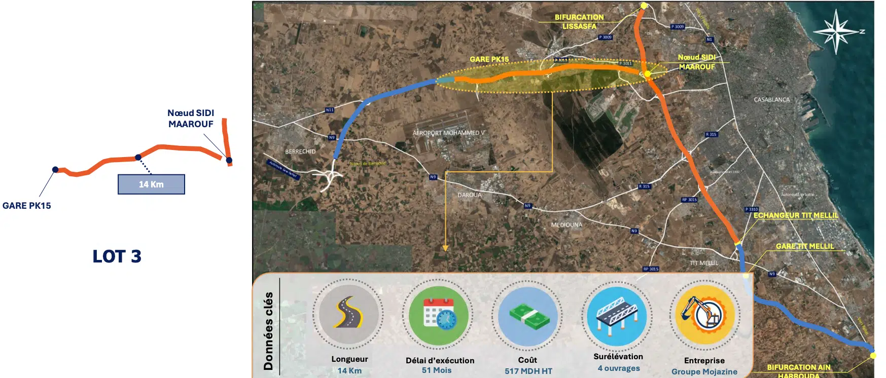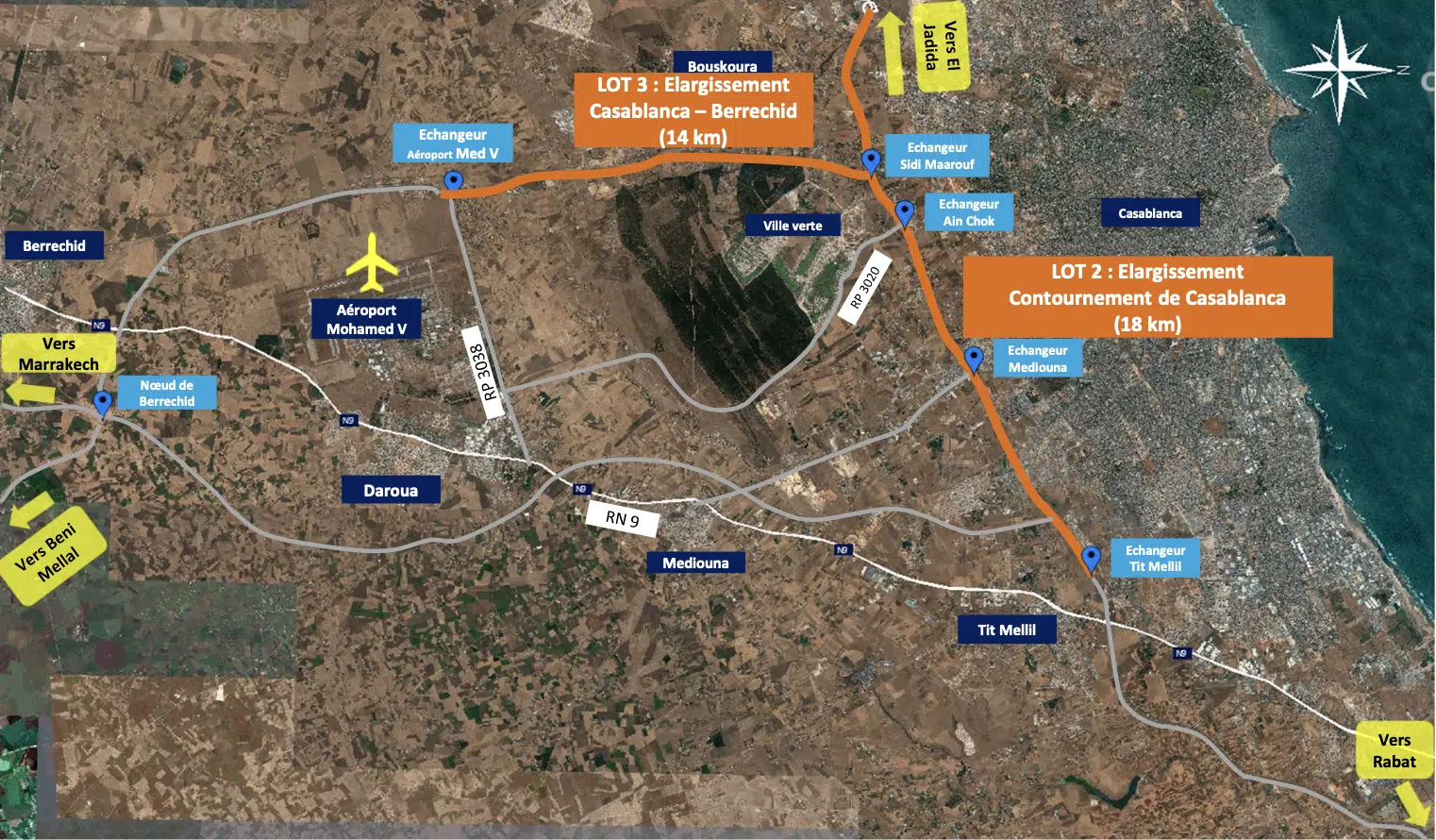 - le troisième lot relatif à l'élargissement de l'autoroute de Casablanca-Berrechid, depuis le nœud de Sidi Maârouf jusqu'à l'échangeur de l'aéroport Mohammed V, sur 14 km.
