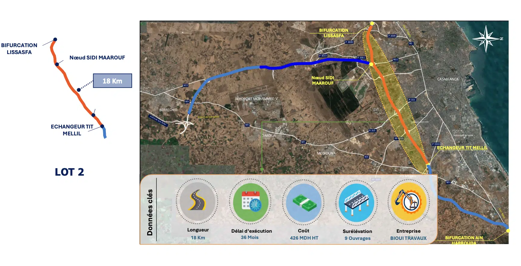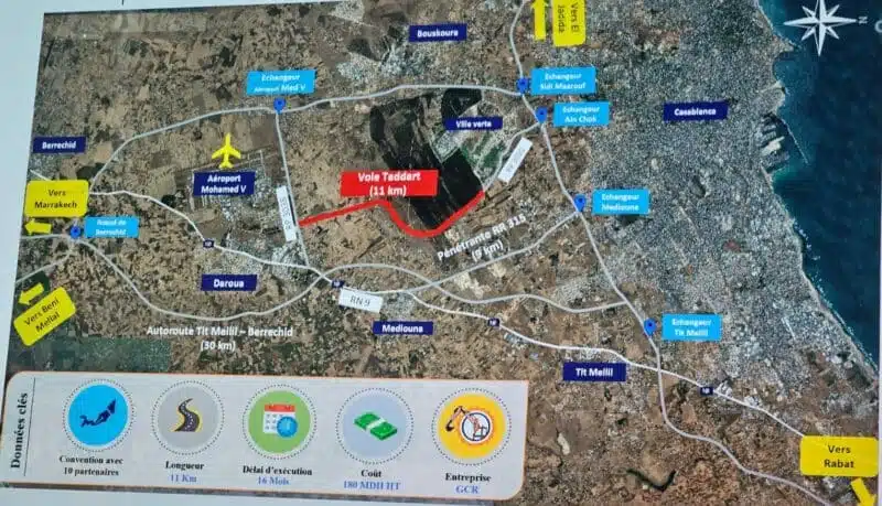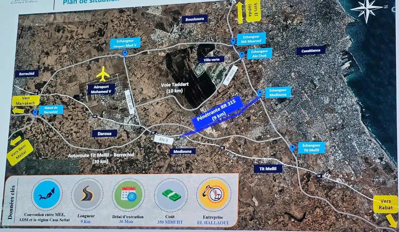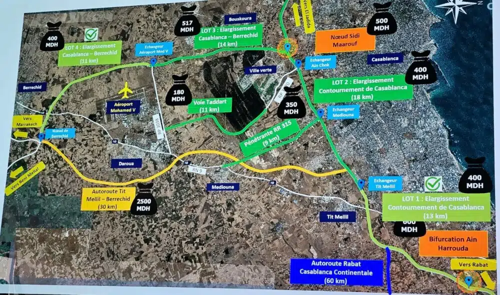 Outre l'élargissement de l'autoroute de contournement de Casablanca et de l'autoroute Casablanca-Berrechid, d'autres chantiers autoroutiers importants ont également été achevés par ADM Projet. Il s'agit notamment de la pénétrante RR315 (en bleu sur la carte ci-dessous), qui assure la jonction entre l’autoroute existante et la nouvelle autoroute Tit Mellil-Berrechid.