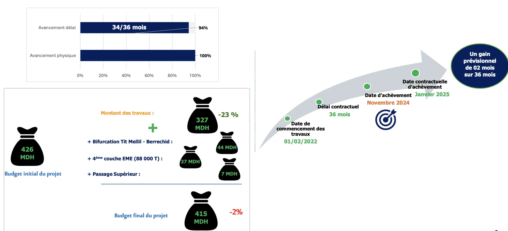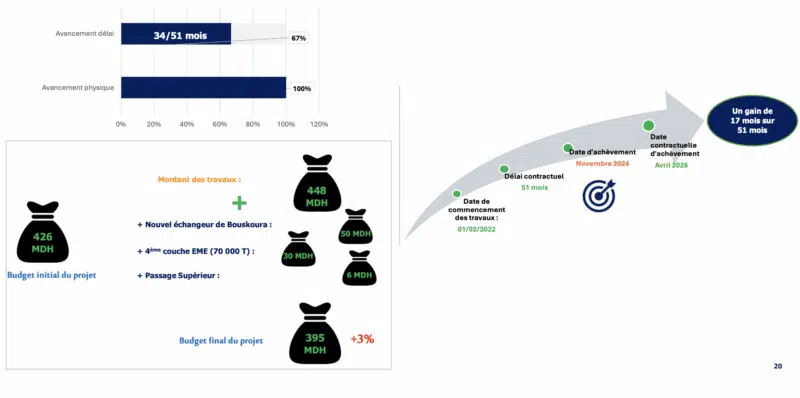 En termes de budget, il a été dépassé de 3%. "Au lieu de 426 MDH mobilisés initialement, nous avons consommé 495 MDH, mais nous avons ajouté une quatrième couche d'enrobé pour augmenter la durée de vie des routes à trente ans, et réalisé un nouvel échangeur au niveau de Bouskoura, l'ancien étant toujours bloqué, ainsi qu'un passage supérieur."