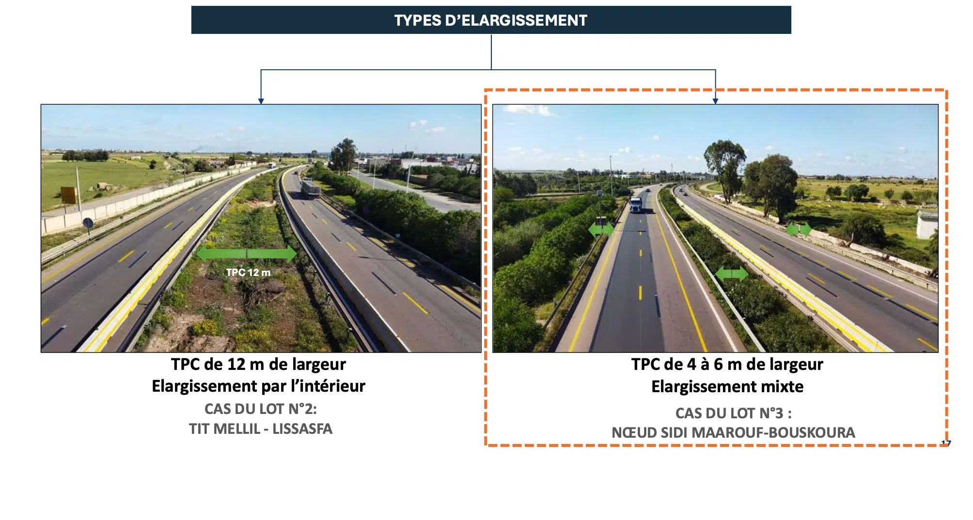 - le premier lot relatif à l'élargissement de l'autoroute de contournement de Casablanca jusqu'à Tit Mellil sur 13 km ;