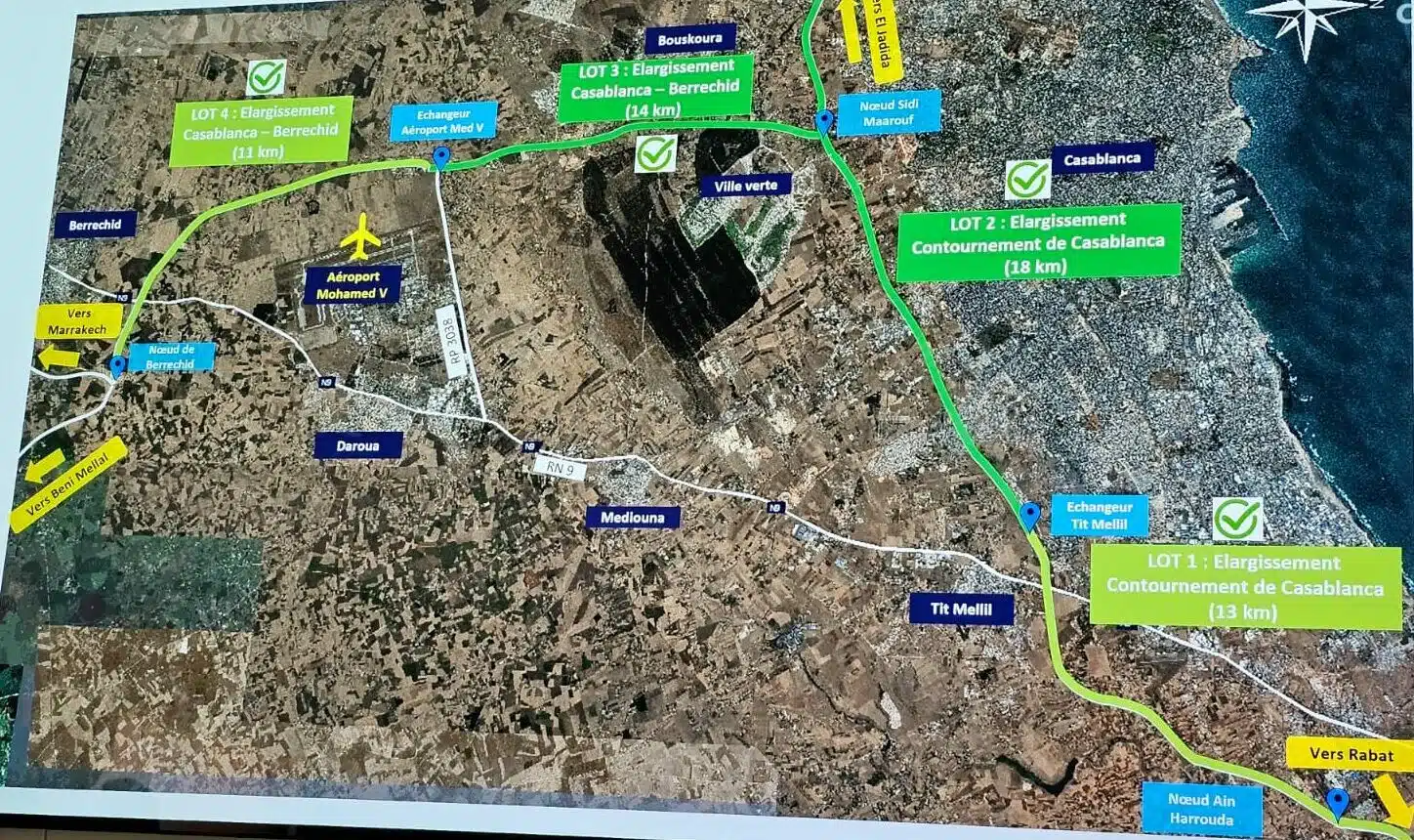 Alors que la réalisation d'autoroutes et de nœuds autoroutiers avance rapidement, certains tronçons importants ont déjà été achevés par la société des Autoroutes du Maroc (ADM), dont l'élargissement de l'autoroute de contournement de Casablanca et celui de l'autoroute Casablanca-Berrechid.