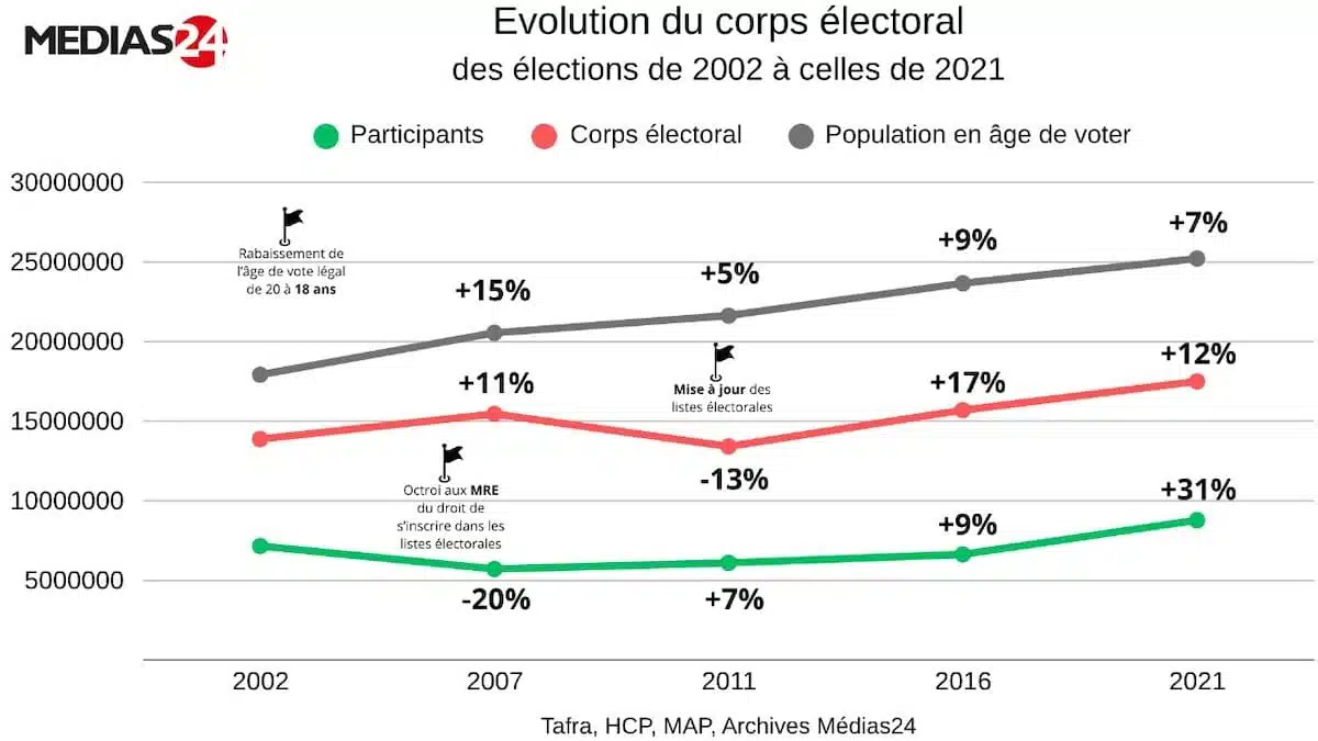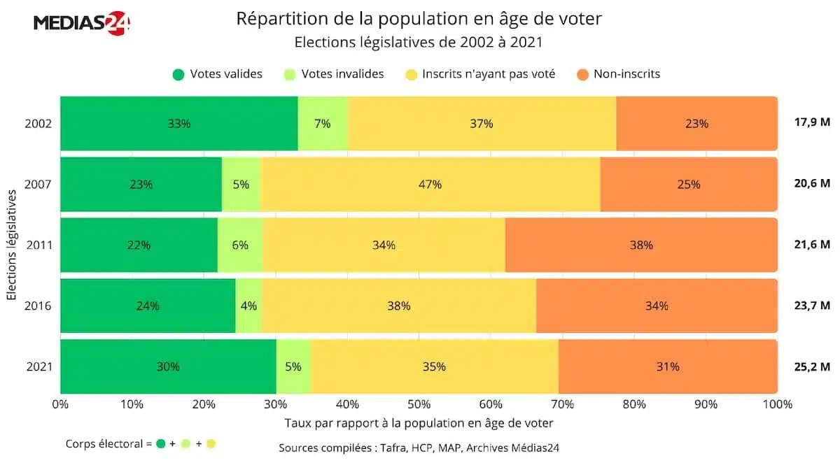 Sur les cinq élections législatives qui ont eu lieu depuis 2002, le taux des votes valides par rapport à la population en âge de voter n’a jamais dépassé 33% (en 2002) ; il est même descendu à 22% en 2011 avant de remonter à 30% en 2021. Ce qui signifie que moins d'un tiers des Marocains en âge de voter décident du sort des législatives.