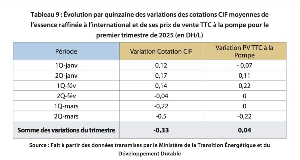 - Essence : "La baisse des prix de cession a été supérieure de 9 centimes par litre par rapport à la baisse des coûts d’achat". (...) "Les opérateurs ont appliqué une réduction des prix de cession moins marquée que celle observée sur les cotations CIF (écart de 20 centimes par litre), mais supérieure à la diminution des coûts d’achat (écart de 0,09 DH/l)".