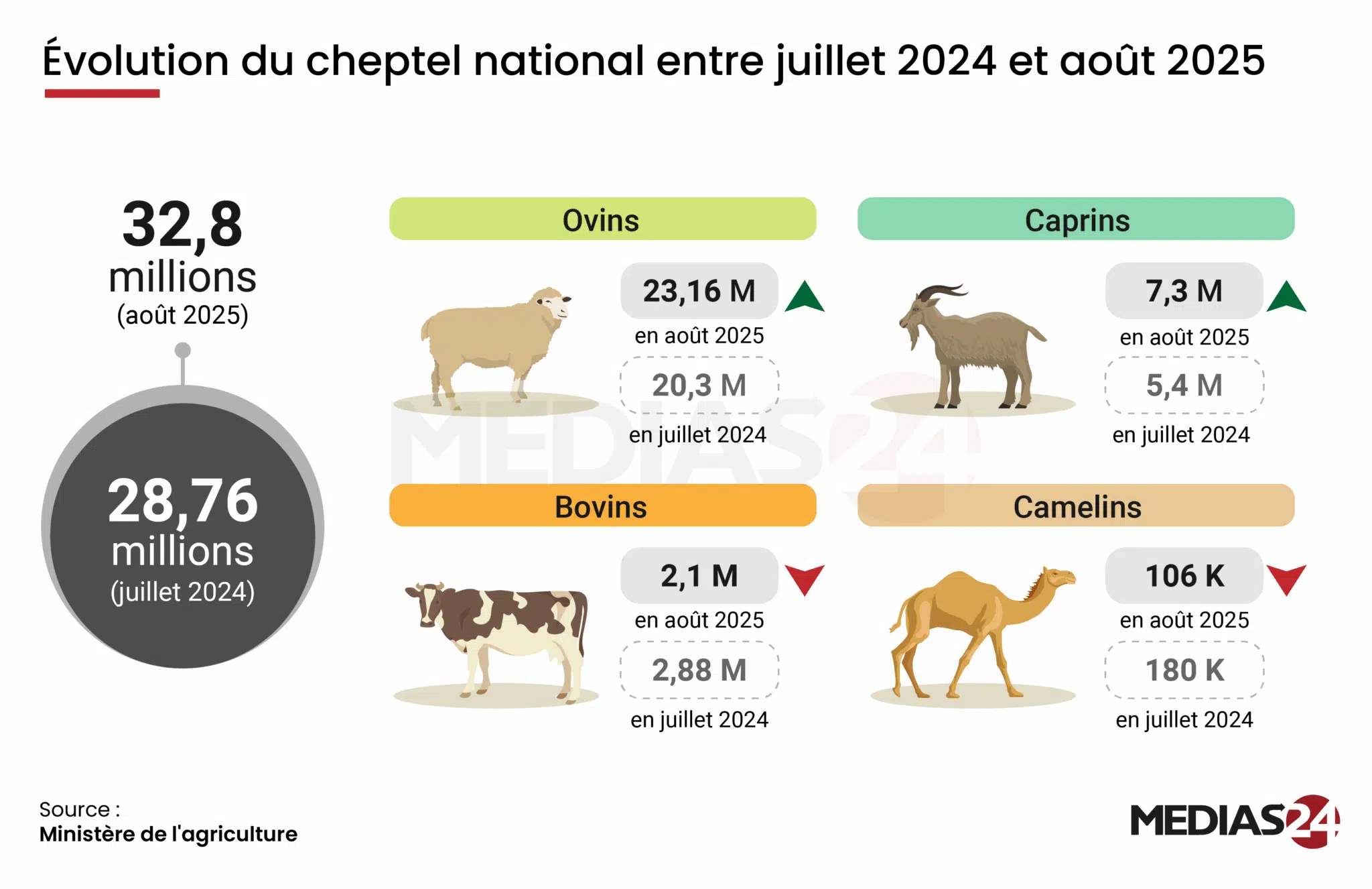 Les résultats du nouveau recensement, réalisé du 26 juin au 11 août par le ministère de l'Agriculture, ont été dévoilés. Les chiffres montrent une amélioration de l'effectif total du cheptel national. Ce dernier est passé de 28,76 millions de têtes en juillet 2024 à 32,8 millions fin août 2025.