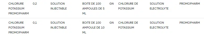 Selon nos propres recherches, la société Promopharm détenait une AMM pour le chlorure de potassium en solution injectable, disponible en boîtes de 100 ampoules de 5 ml ou de 10 ml, qu'elle est en train de renouveler.