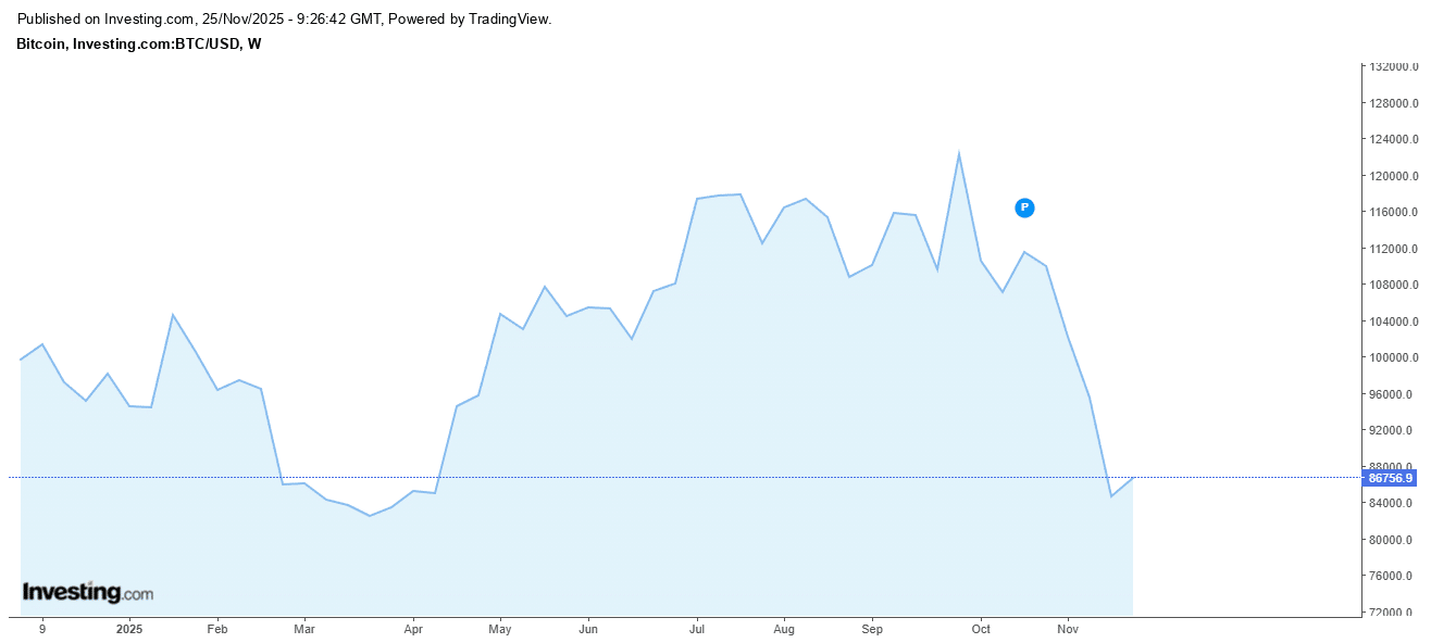 Le Bitcoin est retombé autour de 86.700 dollars et affiche désormais une performance négative dépassant les 6% sur un an glissant. Cette baisse rapide s’explique surtout par la nervosité des marchés face aux taux d’intérêt et par un sérieux manque de liquidité au sein du marché crypto.