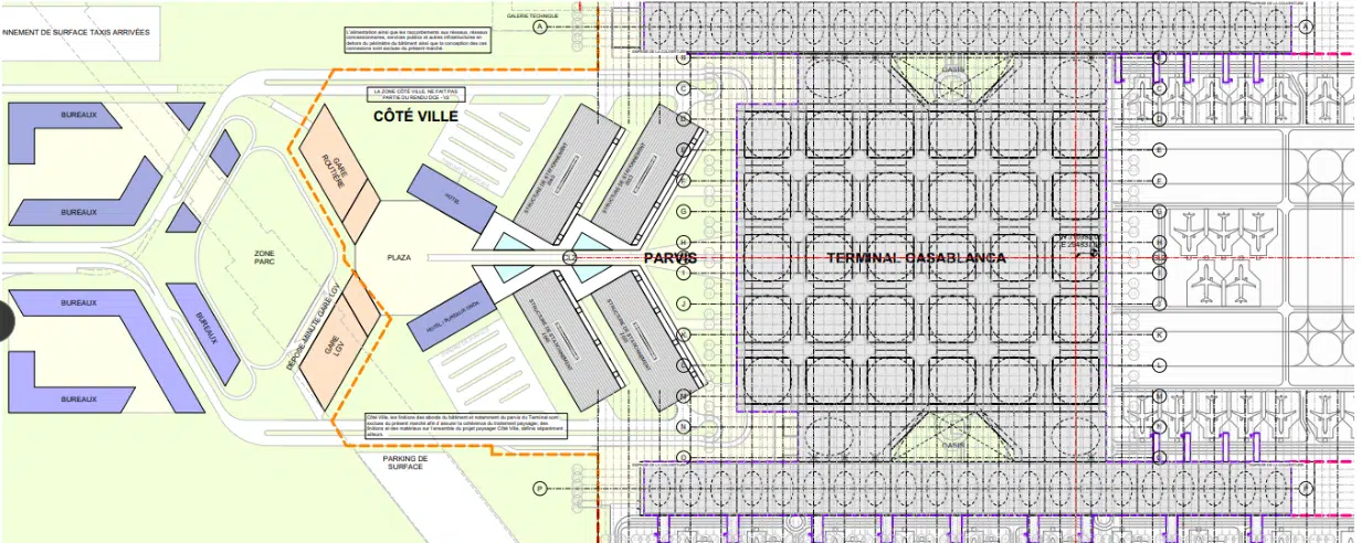 Conçu en forme de "H" avec un processeur central et deux jetées, ce terminal sera relié à la ligne à grande vitesse (LGV) Tanger–Marrakech et intégrera des solutions optimales pour le traitement des bagages, la circulation des passagers et l’utilisation des passerelles.