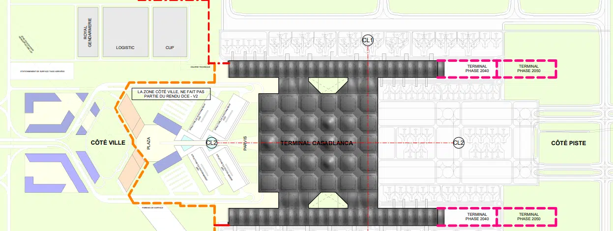 Ci-dessous le plan du nouveau terminal, qui montre des extensions prévues en 2040 et 2050 :