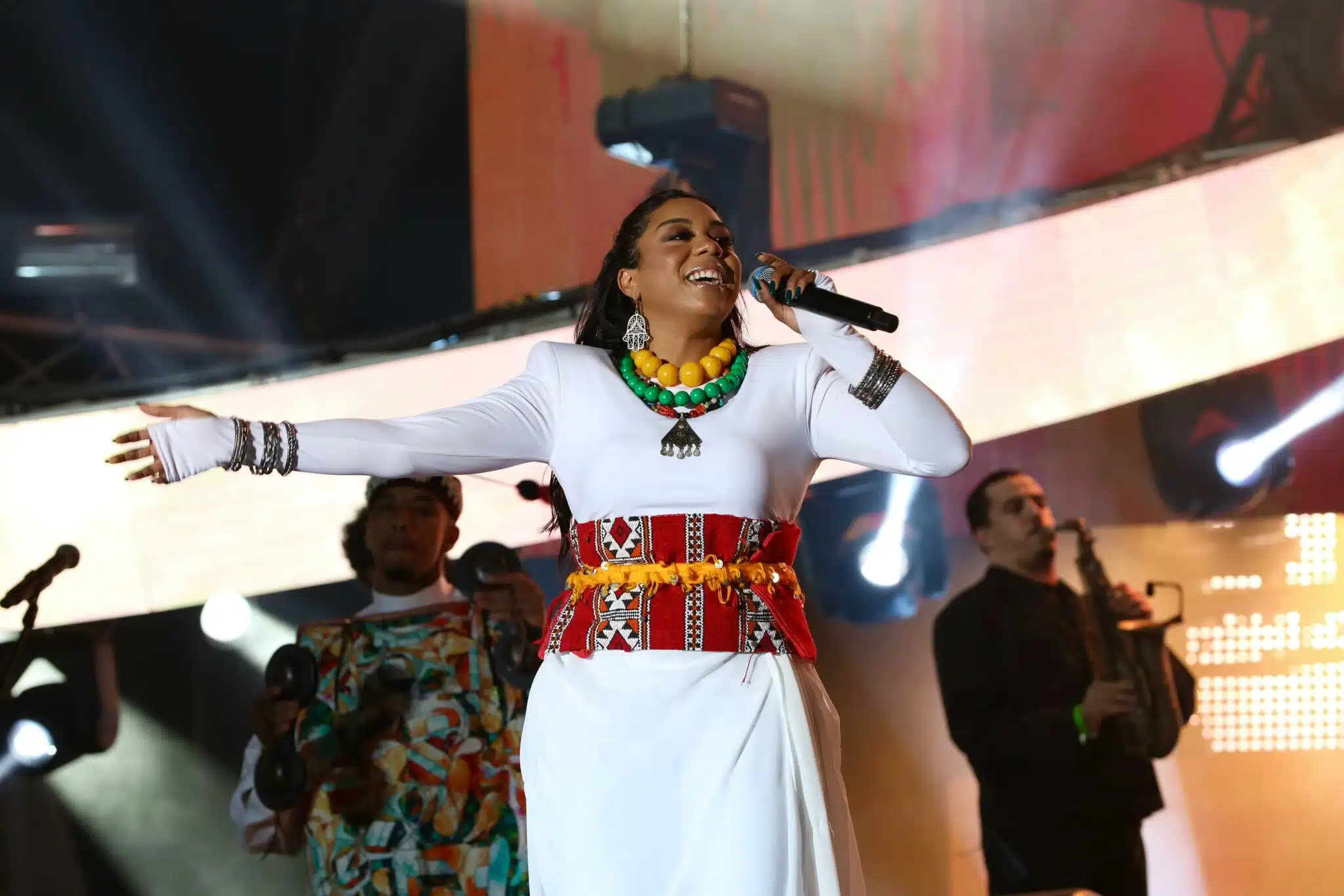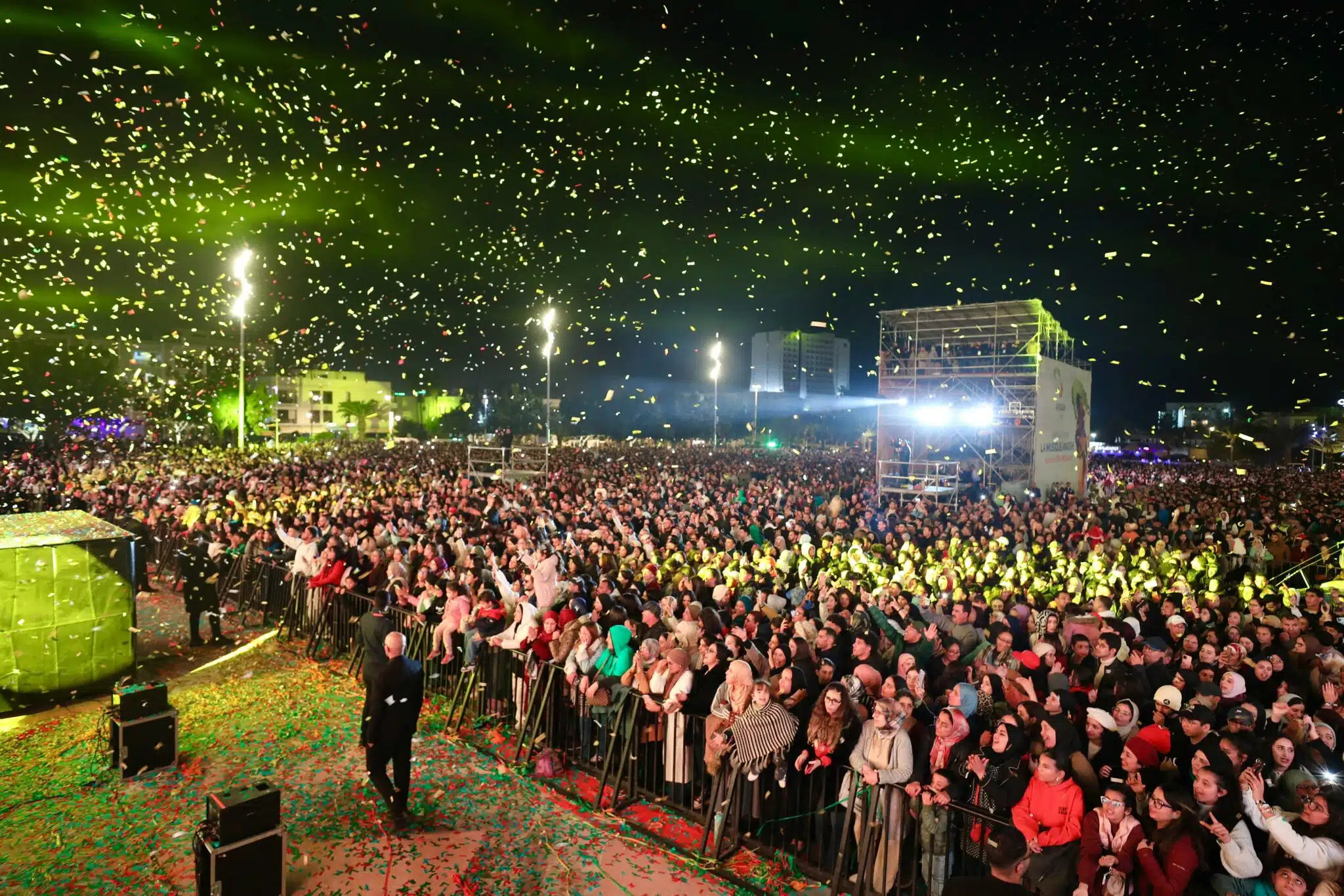 La nuit de clôture du Timitar n’a pas fait dans la demi-mesure. Au théâtre de Verdure, la soirée marocaine a éclaté comme un feu d’artifice retardé : d’abord une flamme, puis une foule entière qui s’enflamme. La brise qui descend des collines apporte avec elle l’odeur du jasmin mêlée aux effluves du thé à la menthe ; les projecteurs découpent des visages, des mains, des spatules de lumière qui frappent la scène. À un moment, on se serait cru dans un film où la ville se penche pour écouter, et pour danser.