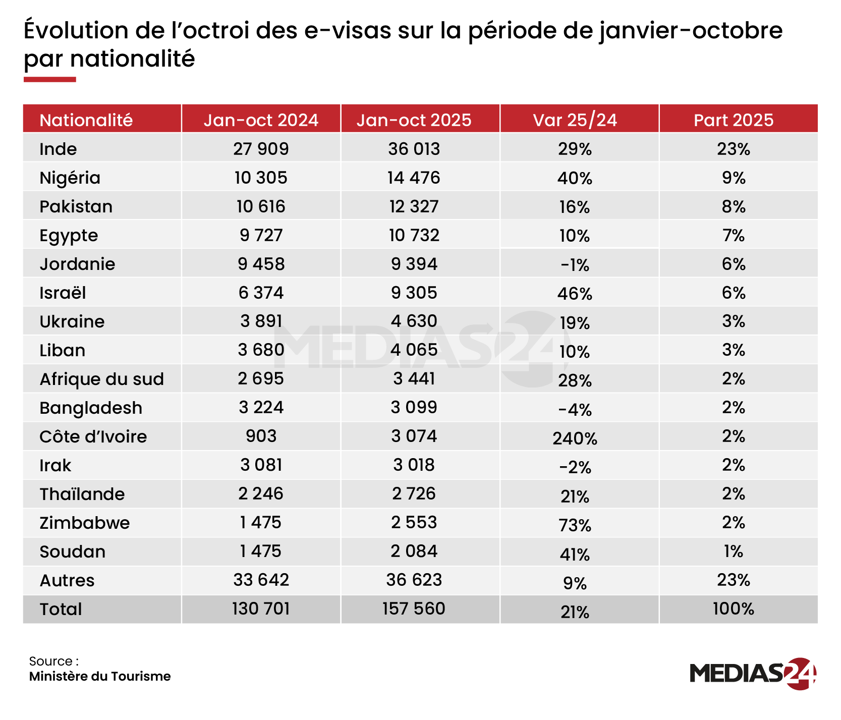 L’analyse des chiffres de délivrance montre une diversification des flux avec 77% des e-visas accordés à 15 nationalités et une montée en puissance de marchés comme la Côte d’Ivoire qui a réalisé une progression spectaculaire de 240%, Zimbabwe (+73%), Israël (+46%), le Nigéria (+40%) et l’Inde (29%).