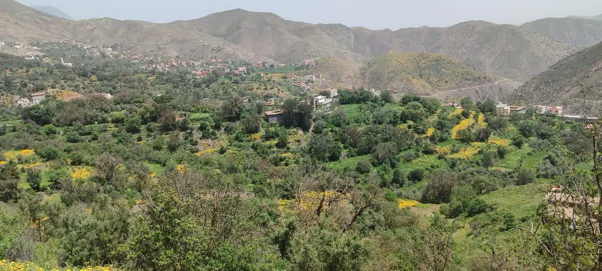 Au bout du voyage, apparaît Tigouliane qui a retrouvé des couleurs. Comme par enchantement le "pays" a verdi. Une verdure à perte de vue composée d’herbe et de fleurs. Des fleurs, beaucoup de fleurs, partout des fleurs. Les herbes et les fleurs ont tout envahi : les versants de montagne, les terrasses, les bordures des sentiers piétonniers et jusqu’aux toits en terre des maisons traditionnelles, où des fleurs parviennent à s’incruster dans les interstices creusées par les dernières pluies. En plus des cultures céréalières cultivées par les paysans, les terrasses croulent sous le poids d’une végétation spontanée : la folle avoine.