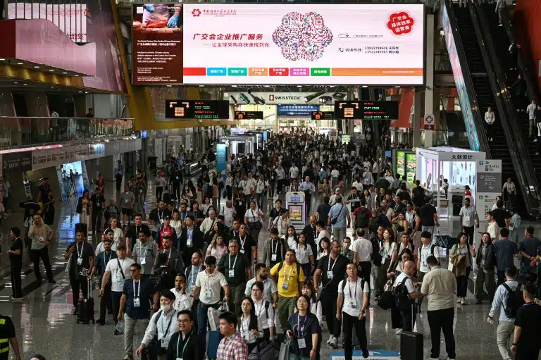 Dans les allées archicombles de la Foire de Canton (sud du pays), au milieu des voitures électriques, machines à glaces et appareils électroménagers chinois, dont les prix ont grimpé avec le conflit, morosité et prudence dominent.