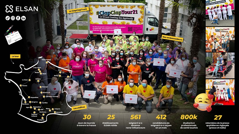 Du 13 juin au 13 juillet, un camion reconfiguré en studio itinérant a sillonné toute la France pour aller à la rencontre de micro-influenceurs soignants dans 26 établissements ELSAN. À la clé, l’équipe de production du ClapClapTour offrait aux soignants volontaires des contenus vidéos originaux produits in situ, à partager sur leurs propres comptes Instagram, TikTok, Facebook... Des capsules "home made" pour ces ambassadeurs légitimes.